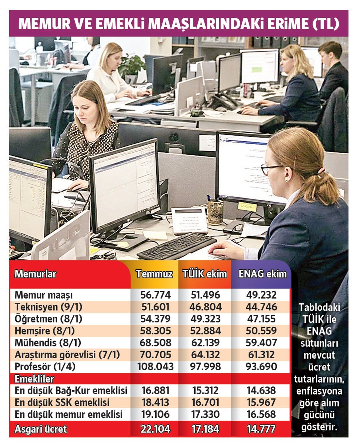 Temmuz ayında yapılan ara zamla 16 bin 881 liraya çıkarılan en düşük emekli aylığının alım gücü TÜİK enflasyonuyla 15 bin 312 liraya, ENAG enflasyonuyla 14 bin 638 liraya düştü. TÜİK enflasyonuyla, temmuzda 18 bin 413 lira olan emekli aylığının alım gücü 16 bin 701 liraya, en düşük memur emeklisi aylığının reel alım gücü de 19 bin 106 liradan 17 bin 330 liraya indi.