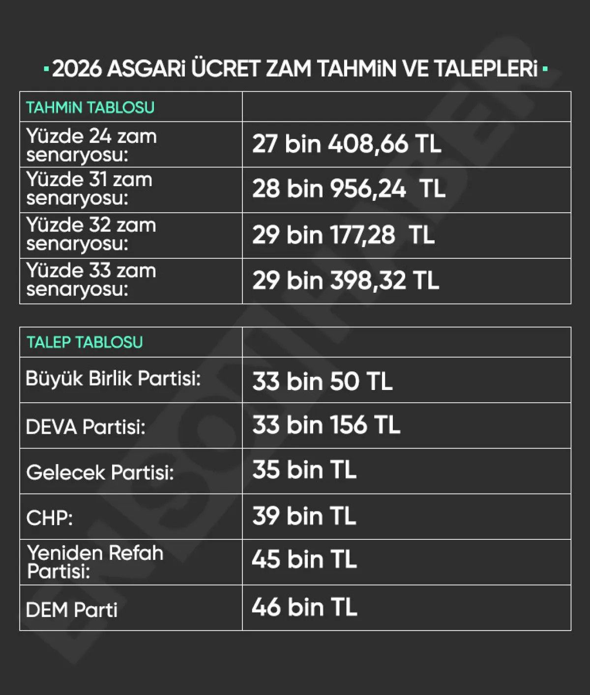 Büyük Birlik Partisi Genel Başkanı Mustafa Destici, geçen yıl enflasyonun yüzde 50 gerçekleşmesine karşın yüzde 30 zam yapıldığını hatırlatarak, “Bu yıl enflasyon yüzde 30-31 bekleniyor. Geçen yıldan kalan yüzde 20, artı yüzde 30 eşittir 50. Yani asgari ücret en az yüzde 50 artmalı. Ve tamı tamına rakam söylüyorum 33 bin 50 TL olmalı.” ifadelerine yer vermişti.