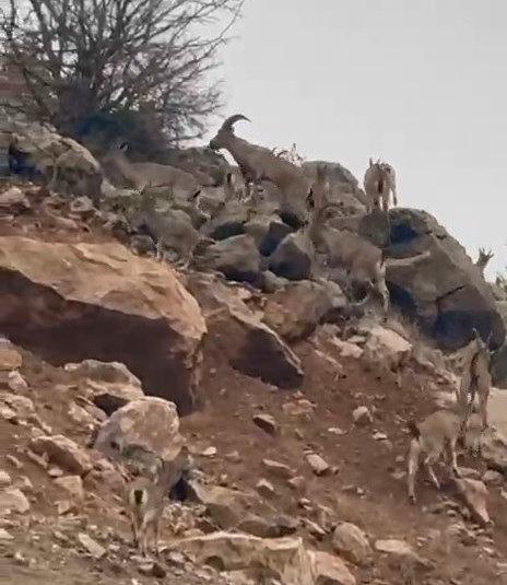 Bölgeden geçen vatandaşlar tarafından cep telefonu kamerasıyla kaydedilen görüntülerde, sayıları oldukça fazla olan keçilerin kayalık alanlarda toplu halde dolaştığı görüldü.