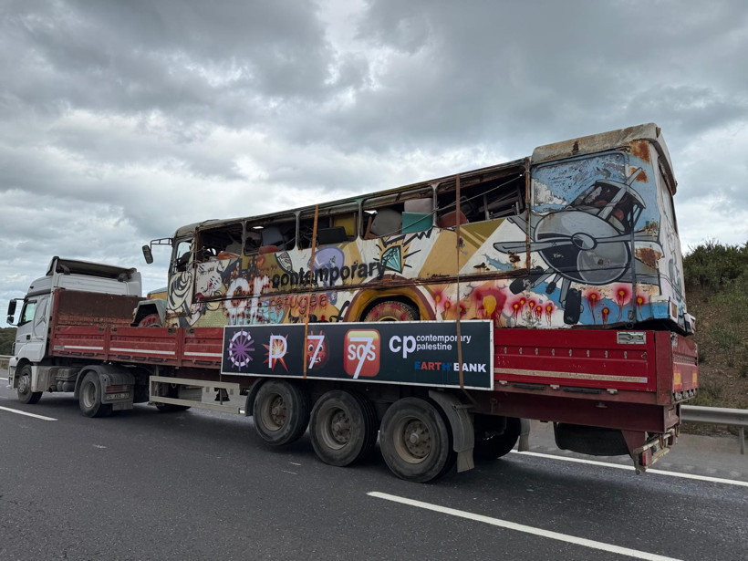 Otobüsün altında logoya göndermelerin olduğu tabloda CP 77 yazıyor. Buradaki 77, 77 yıl önce kurulan İsrail’e bir gönderme.