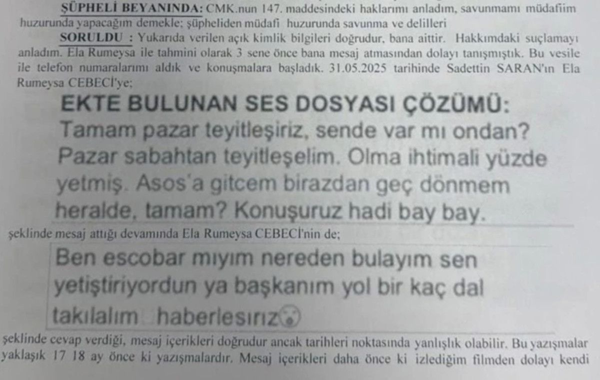 Cebeci’nin adliyede ifadesi alınan Saran ile mesajlaşmaları olduğu öne sürüldü.