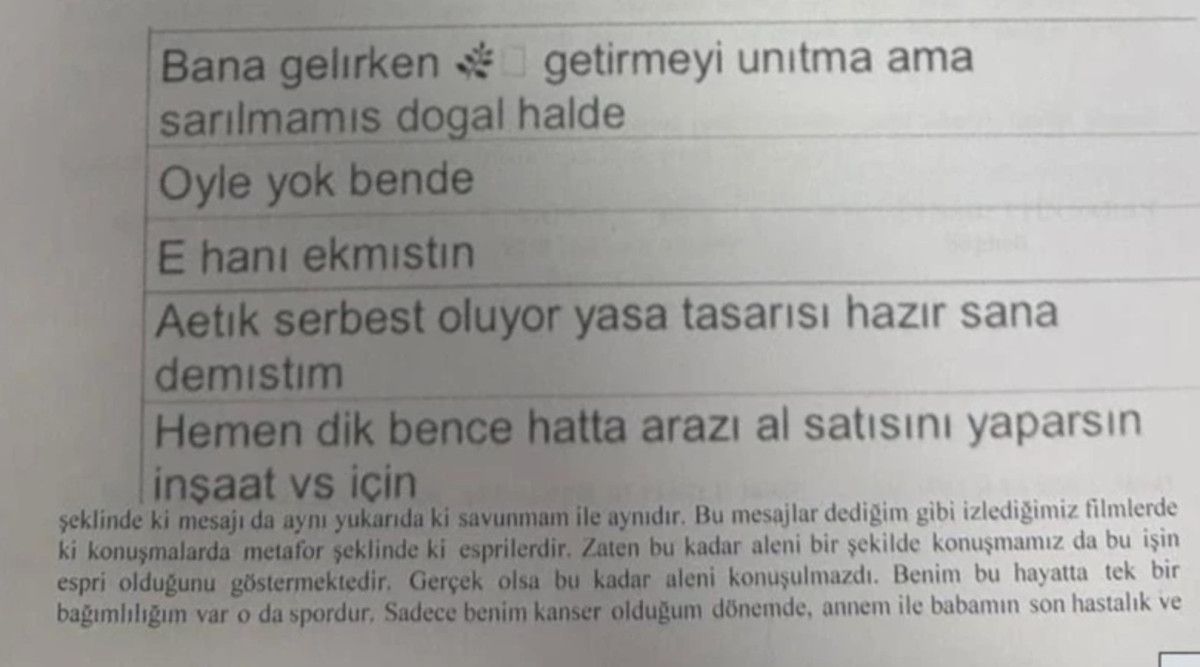 Yine iki isim arasındaki konuşmalarda, Cebeci’nin “Bana gelirken getirmeyi unutma ama sarılmamış doğal olanından” dediği, Saran’ın “O yok bende” dediği ve Cebeci’nin “Ee hani ekmiştin, artık serbest oluyor. Hemen dik bence hatta arazi al satışını yaparsın” dediği görüldü.
