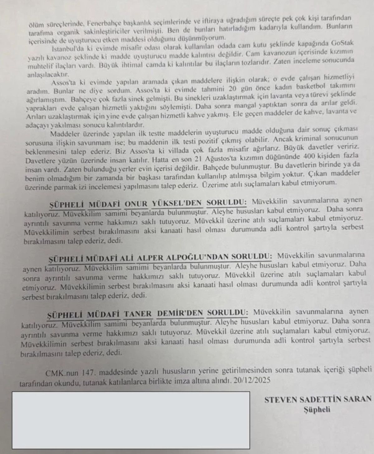 “İstanbul’daki evimde misafir odası olarak kullanılan odada ‘GoStak’ yazılı kavanoz şeklinde ki madde uyuşturucu madde kalıntısı değil. Cam kavanozun içerisinde kızımın ilaçları vardır. Büyük ihtimal camda ki kalıntılar bu ilaçların tozlarıdır. Assos’taki evimde yapılan aramada çıkan maddelere ilişkin olarak; o evde çalışan hizmetliyi aradım. ‘Bunlar ne’ diye sordum. Assos’ta ki evimde tahmini 20 gün önce kadın basketbol takımını ağırlamıştım. Bahçeye çok fazla sinek gelmişti. Bu sinekleri uzaklaştırmak için lavanta veya türevi şeklinde yaprakları evde çalışan hizmetli yaktığını söylemişti. Ele geçen maddeler de kahve, lavanta ve adaçayı yakılması sonucu kalıntılardır.”