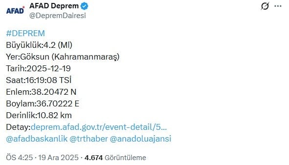Son dakika… Kahramanmaraş’ta deprem! AFAD büyüklüğü açıkladı hilmi fidan 19 Aralık 2025 Posted in Haber Afet ve Acil Durum Yönetimi Başkanlığı (AFAD), Kahramanmaraş’ta saat 16:19’da 4.2 büyüklüğünde deprem gerçekleştiğini duyurdu. Merkez üssü Göksun açıklanan depremin derinliği ise 10.82 km olarak ölçüldü. Author: hilmi fidan