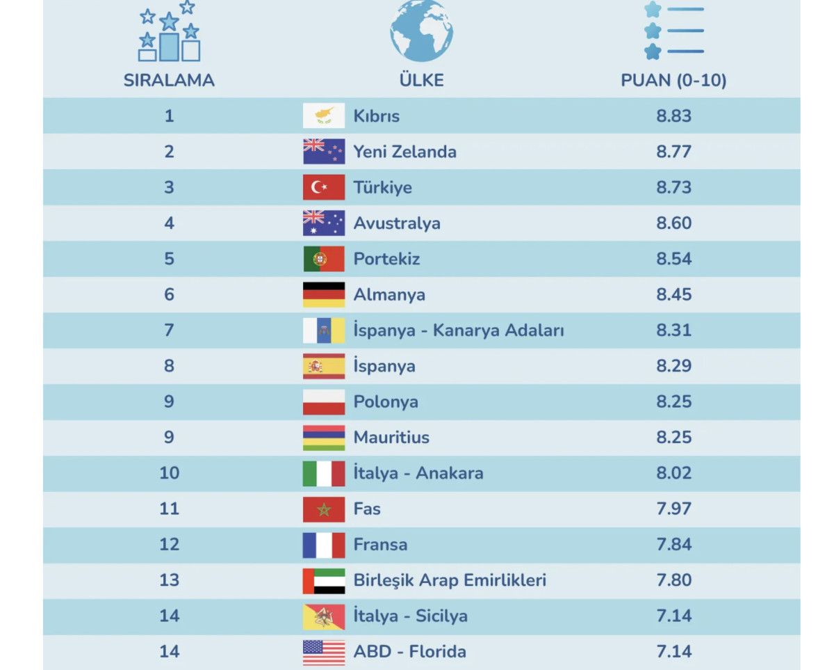 Yeni Zelanda 8,77 puanla ikinci sırada yer aldı.